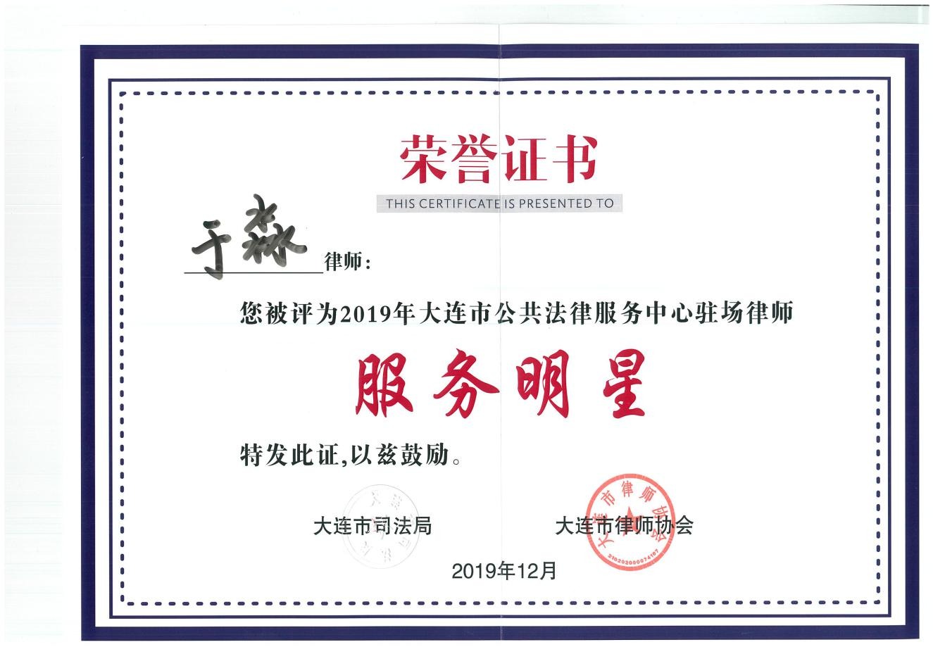 我所于淼律师荣获“2019年 大连市公共法律服务中心驻场律师服务明星”称号